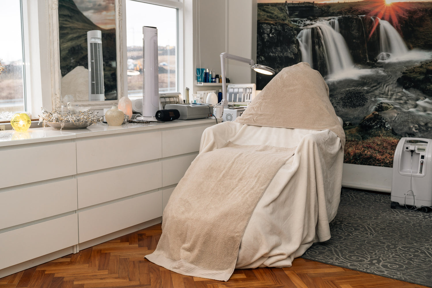 Demantshúðslípun, súrefnismeðferð og stofnfrumuboozt með gullmaska í lokin.